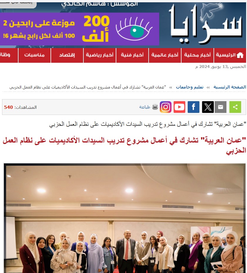 Amman Arab University participates in the work of the project to train academic women on the party work system