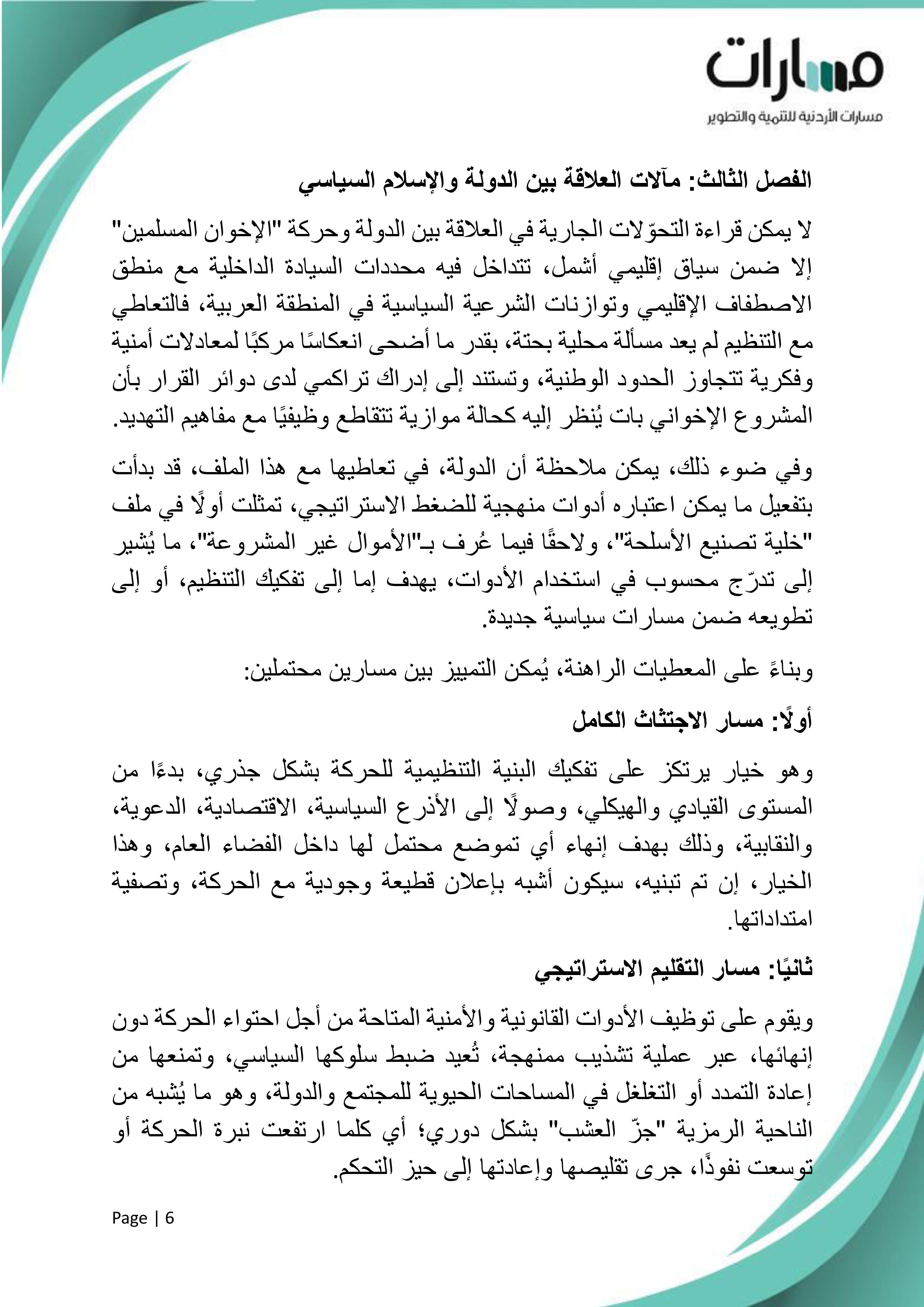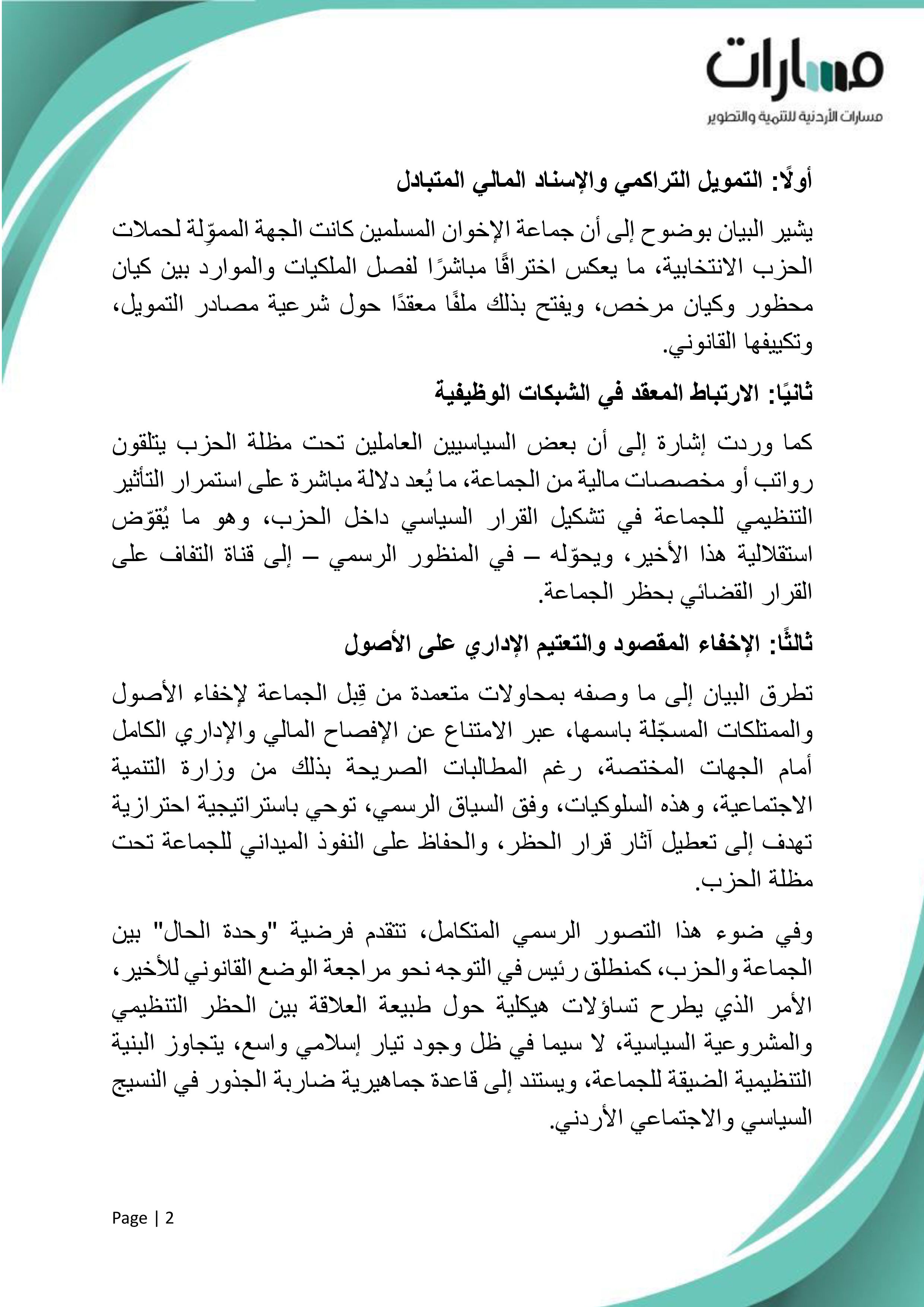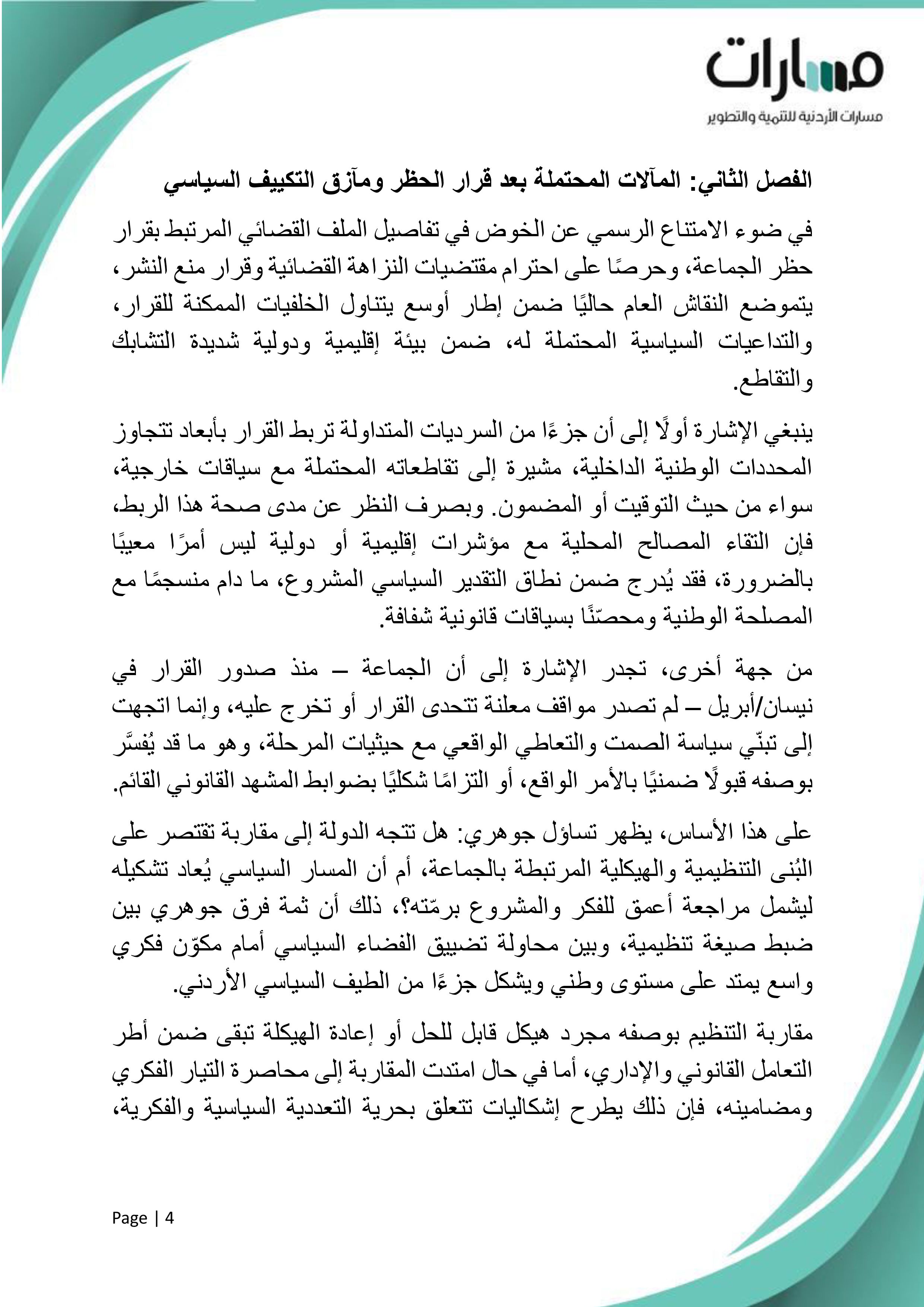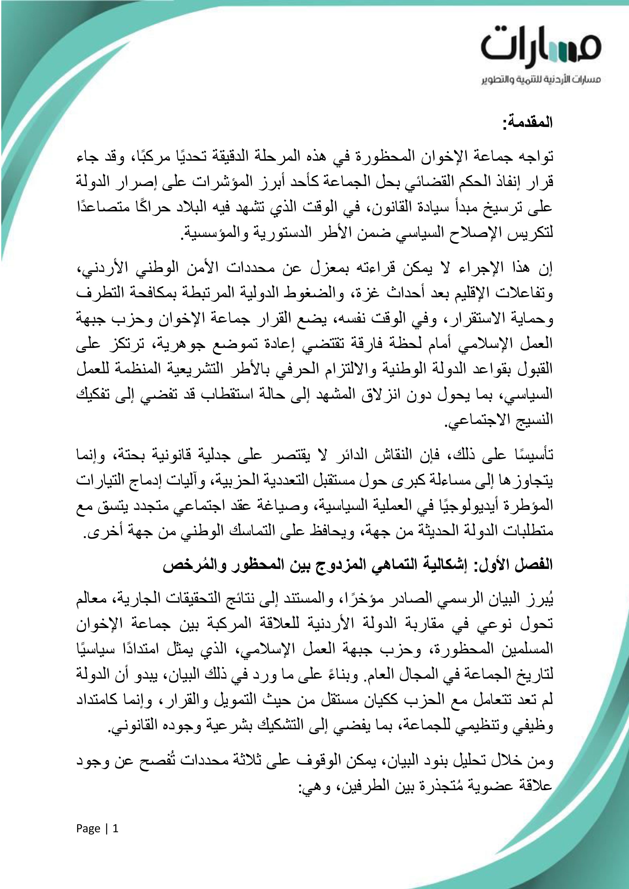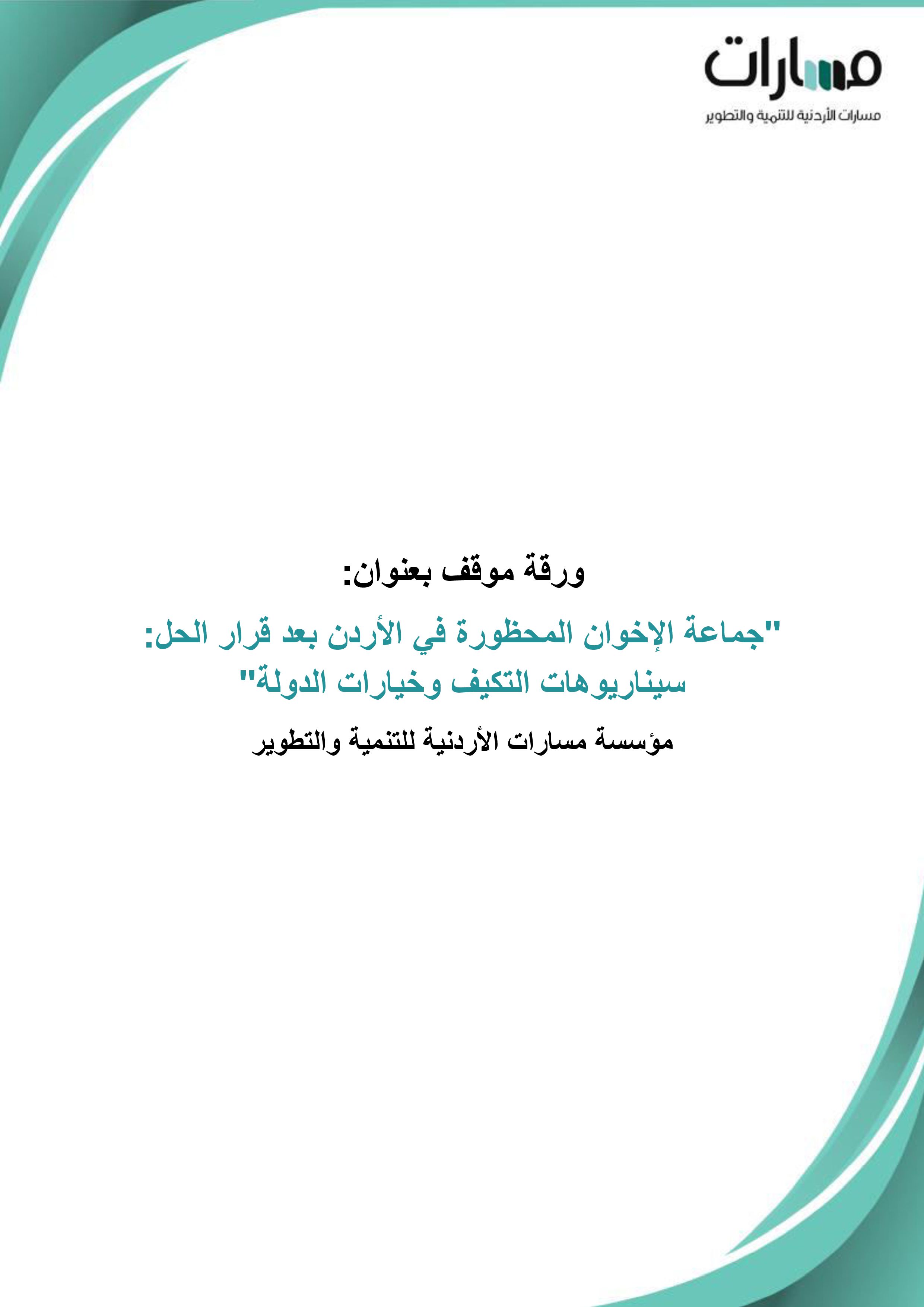 ورقة موقف بعنوان: "جماعة الإخوان المحظورة في الأردن بعد قرار الحل: سيناريوهات التكيف وخيارات الدولة"