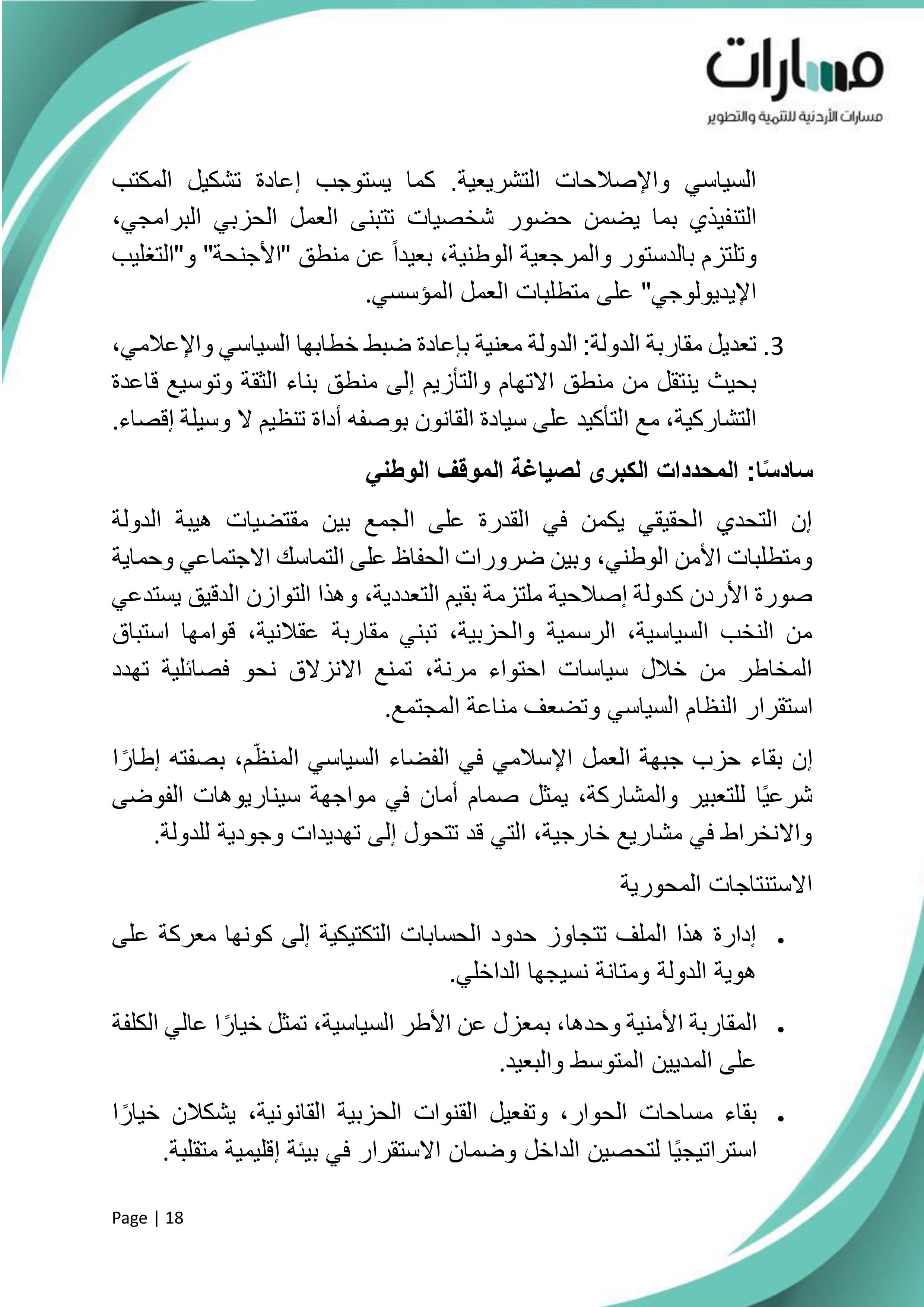 ورقة موقف بعنوان: "معادلات التحوط والبناء في الأردن... قراءة موضوعية لتحديات الشرق الأوسط المتجددة"
